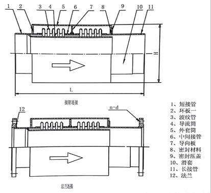 此類膨脹節(jié)的基本性能與軸向內(nèi)壓型波紋補償器相同,增加了外殼與導向環(huán),因此可直埋地下,同時該類膨脹節(jié)安裝簡單,其抗彎能力可以不考慮管道下沉的影響,廣泛用于補償熱力管道的冷熱變形。